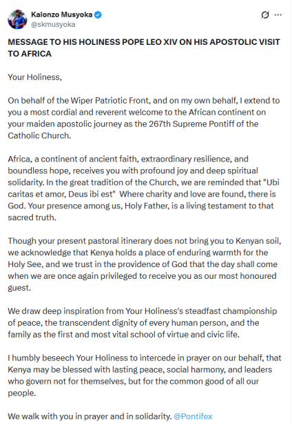 Wiper leader Kalonzo Musyoka has reached out to Pope Leo XIV, seeking prayers for Kenya amid rising political and economic challenges. His message comes at a time when the country is facing growing tension and uncertainty ahead of the 2027 elections.